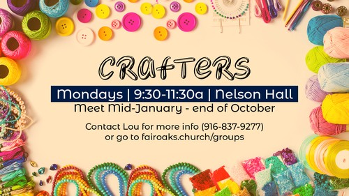 Interested in crafting? We have a group that meets weekly on Mondays (January-October). This group helps create and prepare items for our annual Craft Fair in November. Contact Lou for more information (916-837-9277).