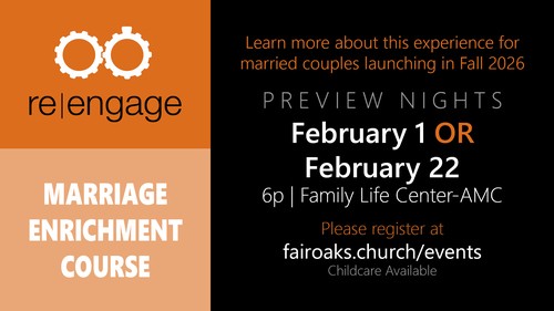 This will be an informational meeting to hear more about this experience for married couples from Re|Engage Group Leaders. For those interested in participating, we look forward to launching this in fall 2026. Please Register below to 2/1 or 2/22!
