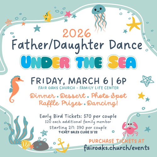 For Dads, father-figures and daughters of all ages! This year's theme is "Under the Sea" so dress to impress and get ready to dance the night away--because our dance floor will be o-fish-ally open for all the best moves. This event includes dinner, dessert, raffle prizes, a photo spot, and of course, DANCING!