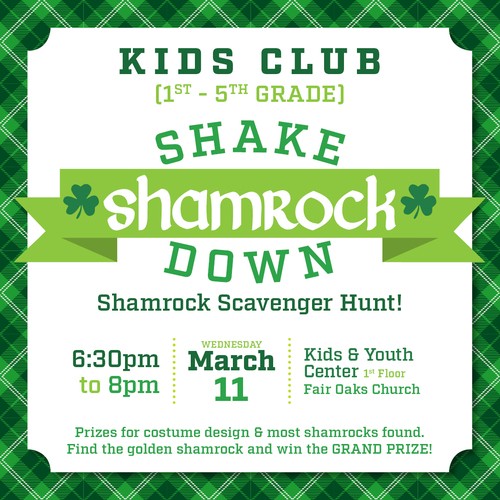 You're invited to a special night of Kids Club! Wear green and join us for the Shamrock Shakedown! Kids will get to participate in a fun shamrock scavenger hunt around the campus. We'll have prizes for best costume and most shamrocks found. Find the golden shamrock and win the grand prize! This is a great opportunity to invite friends.