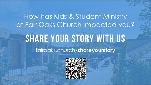 We’d love to hear how God has been at work in your life or your family through the Kids or Student Ministry at Fair Oaks Church! You sharing a piece of your story helps us celebrate what God is doing and encourages others. Whether you're a parent, leader, student, or kid, we invite you to share. This allows us to share with our greater church community how God is at work in ways they might otherwise not see or know about. Thank you for sharing!