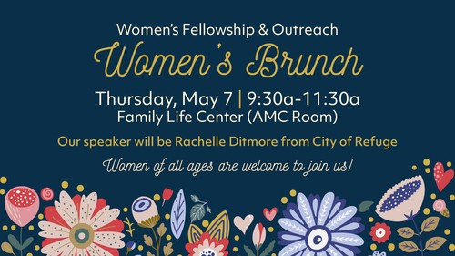 Women of all ages are welcome to this monthly brunch and fellowship gatherings. We meet the first Thursday of most months from 9:30-11:30a. On 5/7 our speaker will be Rachelle Ditmore from City of Refuge.