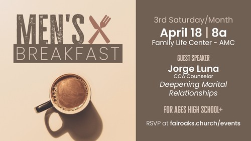 All men (high school and up) are invited to join us for breakfast on Saturday, 4/18/26 from 8a-10a. We'll meet in the Family Life Center. RSVPing helps us ensure we have enough food for everyone!