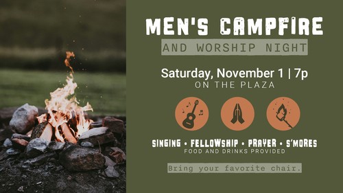 Calling all guys! Join us on Saturday, November 1st at 7pm on the Plaza. Bring your own chair! Join us for fellowship, worship, and prayer time. Snacks and drinks provided.
