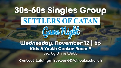 Singles (30-60) join us for a SETTLERS OF CATAN game night! We will meet Wednesday, November 12 at 6p in the Kids & Youth Center Room 9. See you there!