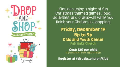 Hey Parents! You can drop off your kids on Friday, 12/19 from 5-9p and get all that last-minute Christmas shopping done! Kids will enjoy a night of fun Christmas-themed games, food, activities, and crafts.