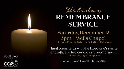 A holiday remembrance service facilitated by David Howell, from CCA (Community Counseling Associates), hosted at Fair Oaks Church in Wells Chapel (located from the back parking lot).