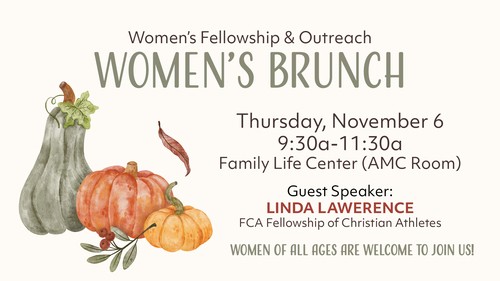 Women's Fellowship Outreach hosts brunches the first Thursday of each month. You can expect to hear from different speakers and missionaries/mission organizations each month. Women of all ages are welcome to join us on November 6th from 9:30a-11:30a in the Family Life Center in the AMC room.