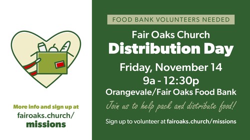 Partner with us at the Orangevale-Fair Oaks Food Bank on distribution days! We're looking for volunteers to serve at the food bank and help distribute food from 9a-12:30p the second Friday of each month! This is one way we can help care for those in our community, and partner with local ministries. Sign up to help below.