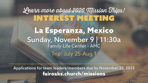 We have mission trip opportunities for 2026! Prayerfully consider how God might be calling you to serve around the world next summer. Applications for team leaders and team members are now open (and will close after November 23, 2025). Consider attending upcoming interest meetings to learn more about each trip. The Mexico trip interest meeting is 11/9 at 11:30a.