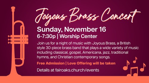We are hosting Joyous Brass, a British style 30 piece brass band that plays a wide variety of music including classical, gospel, Americana, jazz, traditional hymns, and Christian contemporary songs. Free admission concert with love offering.