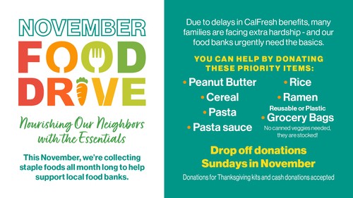 We’re collecting essentials all month long to help support local food banks! Due to delays in CalFresh benefits, many families are facing extra hardship, and our food banks urgently need the basics. You can help by donating these priority items: Cereal, Peanut Butter, Ramen, Rice, Pasta and Pasta Sauce (and plastic and paper grocery bags) in November. Drop off donations on Sundays in November in church lobby. NOTE: The food bank has ample supply of canned vegetables from the community-wide food drive in October.