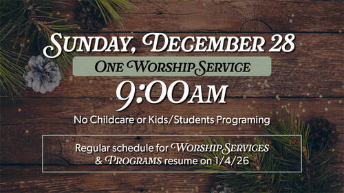 For the last Sunday of 2025, we will have ONE service on December 28th at 9am only. There will be no childcare or programs for kids/students to give our teams and volunteers a holiday break. We will resume our regular schedule for services and programs on January 4, 2026.