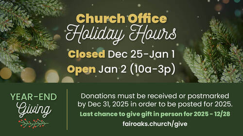 The church office will be closed December 25 - January 1 for the holidays. We will be open on Friday, January 2 (normal office hours: 10a-3p).