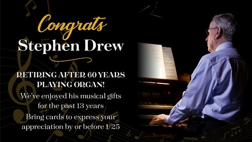 We're grateful that Stephen has shared his musical gift for playing organ at our church for the past 13 years. At the end of January, he will be retiring from playing after 60 years! We encourage you to bring cards/gifts to express your gratitude on his last official Sunday playing on January 25th.