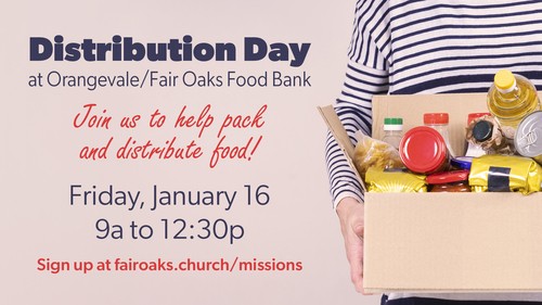 Partner with us at the Orangevale-Fair Oaks Food Bank on distribution days! We're looking for volunteers to serve at the food bank and help distribute food from 9a-12:30p! This is one way we can help care for those in our community, and partner with local ministries. Sign up to help!