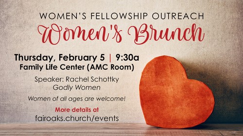 The WFO group hosts a monthly brunch for all women the 1st Thursday of the month from 9:30-11:30a. A great time of food, fellowship, and the opportunity to hear from various outreach partners, missions organizations, and other speakers. February's speaker will be Rachel Schottky.